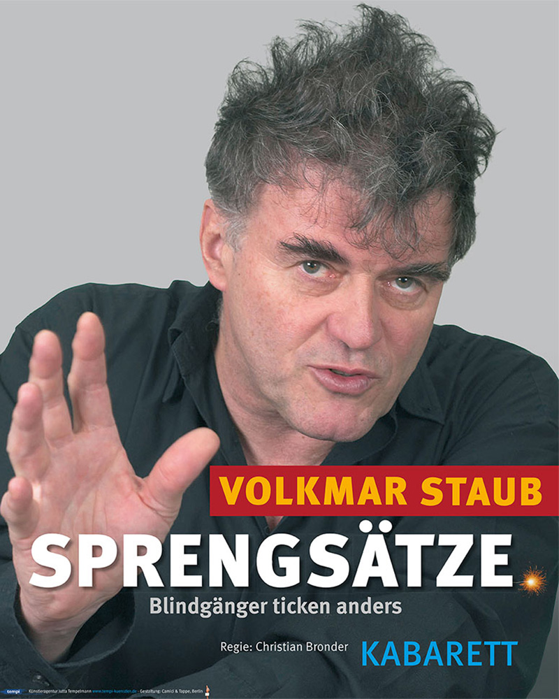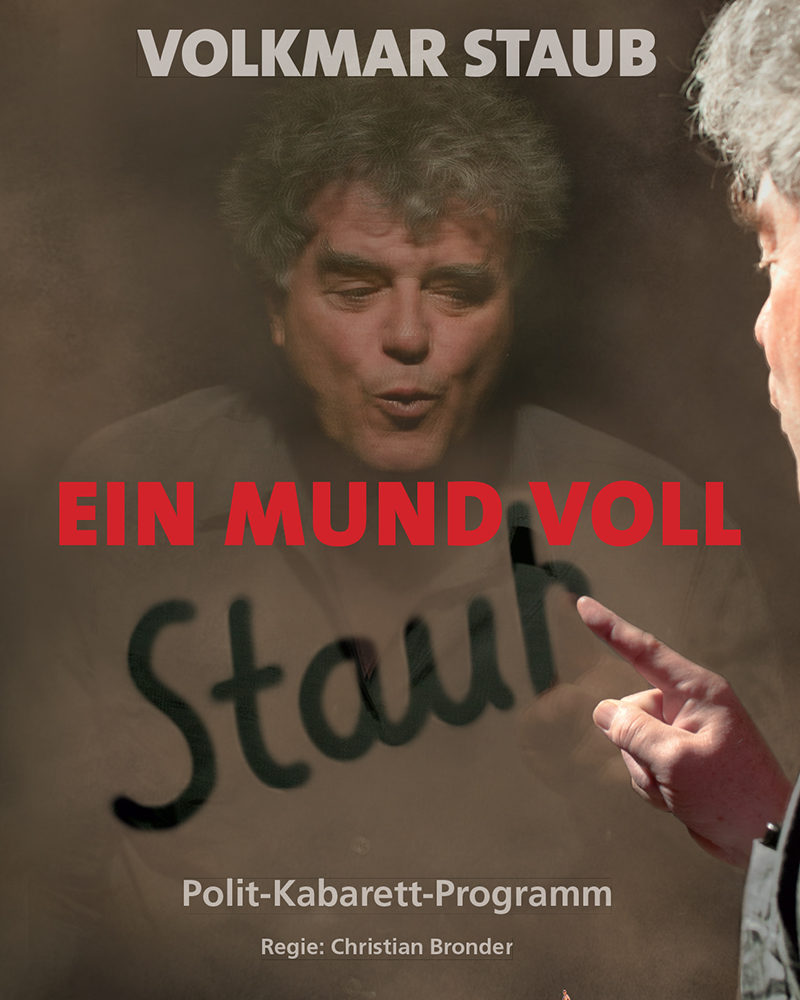 Seit 1987 hat Volkmar Staub verschiedene Solo-Programme geschrieben und gespielt: »Humanismousse au chocolat «(1987) »Gestyltes Deutschland«(1989) »Keep Styling« (1991) »Jenseits von Reden« (1993).
